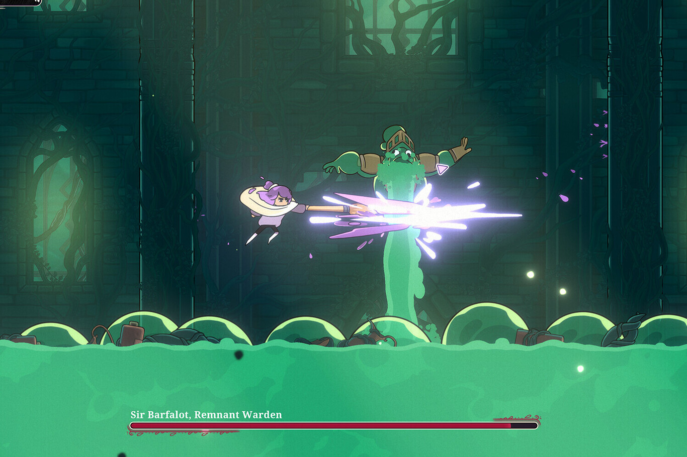 La primera es regresar al templito zen en el que descansaste la última vez, hacer la vuelta de la vergüenza y a volver a intentarlo. Pero hay otra opción muy interesante: el juego te devuelve justo donde estabas pero le da una mejora de resistencia a los enemigos. Ya no puedes usar el dash para atravesarlos, pero recibes más cura al matarlos. ¿Entiendes ahora el espíritu del juego? Constance quiere ir rápido a la chicha, no agobiarte demasiado con esas cositas Souls-Like que ahora tienen los metroidvania, ser difícil porque eso es parte de su historia, pero nunca llegar a frustrarte.