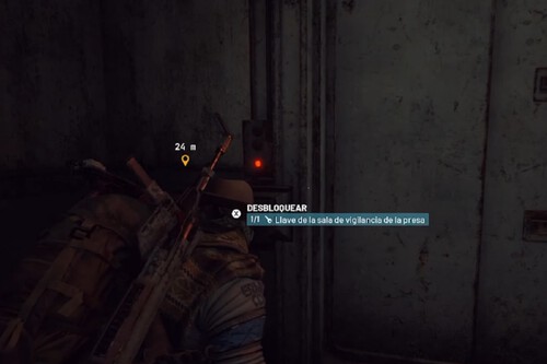 Basta con encontrar la puerta con la luz roja en el pulsador para identificar que se trata de esa en concreto y tener la llave en el inventario. No necesitas pasarla desde el bolsillo seguro a la mochila o a los huecos de acceso rápido, al acercarte te pondrá "1/1 Llave de la sala de vigilancia de la presa" y podrás usar el botón para abrir la sala. Dentro encontrarás taquillas, una funda de arma y varias bolsas más.