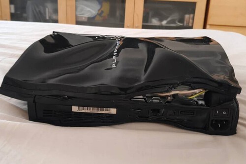 Por si la fotografía superior dejaba alguna duda, el título del post original era "He derretido mi PS3 de forma accidental". Según relata, usó un vídeo de YouTube como tutorial, envolviendo la consola en la toalla y aplicando calor desde el secador durante unos 10 minutos. No hizo falta más, con todo ese calor acumulado, la carcasa de la consola se deformó en un abrir y cerrar de ojos.