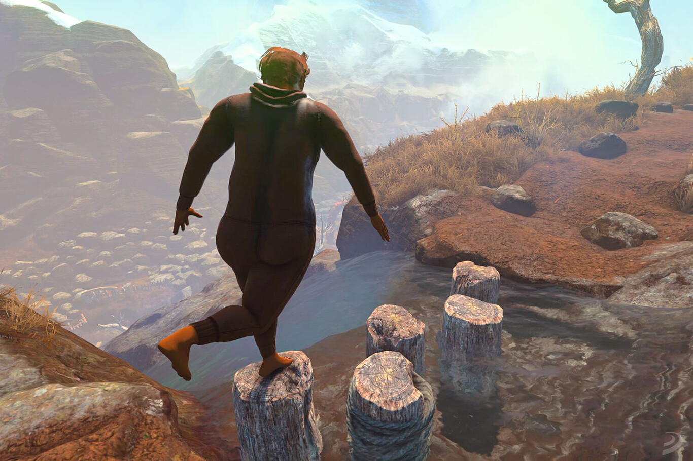 Lo primero que llama la atención sobre Baby Steps es que su única mecánica es caminar. Cada gatillo levanta una pierna, elevando más o menos la rodilla en función a la profundidad con la que se pulse. Luego, con el stick, podemos mover dicha pierna hacia delante o hacia atrás para elegir la zona donde queremos pisar. Por último, al soltar el gatillo se apoya el pie y hay que repetir el proceso con la otra pierna. Pon un pie demasiado alante y perderás el equilibrio, confúndete pulsando un botón y también te irás al suelo. Mi primera partida duró más de 40.000 pasos, así que imaginate cuantas veces se puede llegar a caer.